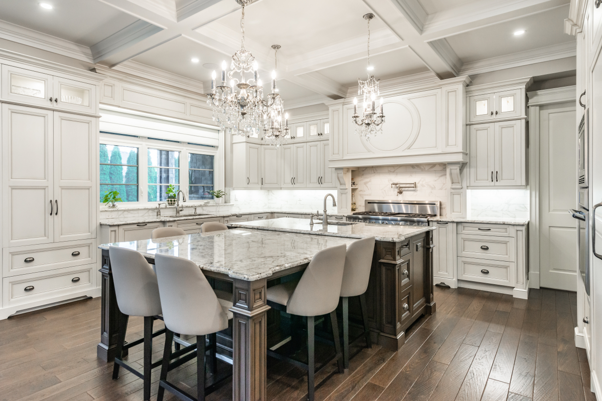 This stunning home is beautifully finished throughout with rich trim, molding and coffered ceilings. Arch windows with keystones and grills give the exterior a look of stately elegance. Traditional room arrangement creates sophisticated spaces for entertaining, gathering and family living, and a luxurious enclosed outdoor patio connects the main living area to the outdoors.